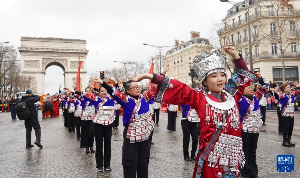2月1日,在法国首都巴黎的香榭丽舍大街,人们在巡游活动上表演苗族传统舞蹈。新华社记者 崔可欣 摄