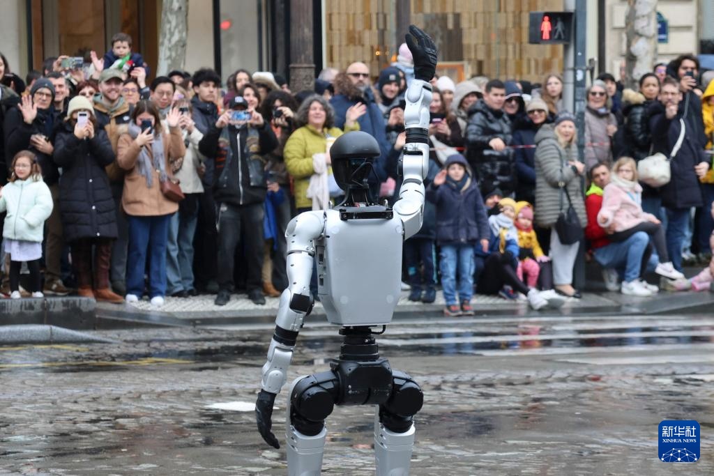 2月1日,在法国首都巴黎的香榭丽舍大街,由宇树科技及其法国代理INNOV8集团提供的机器人在巡游活动上向观众挥手致意。新华社记者 张百慧 摄