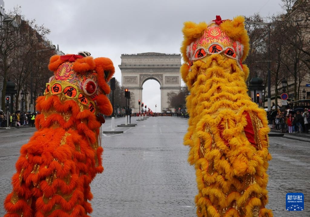 2月1日,在法国首都巴黎的香榭丽舍大街,人们观看巡游活动上的醒狮表演。新华社记者 张百慧 摄