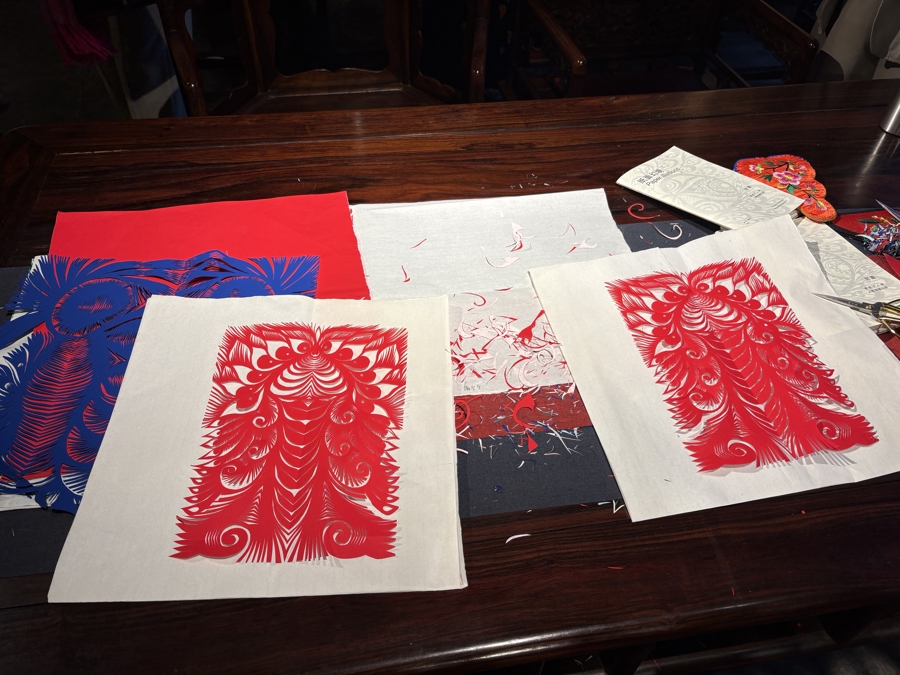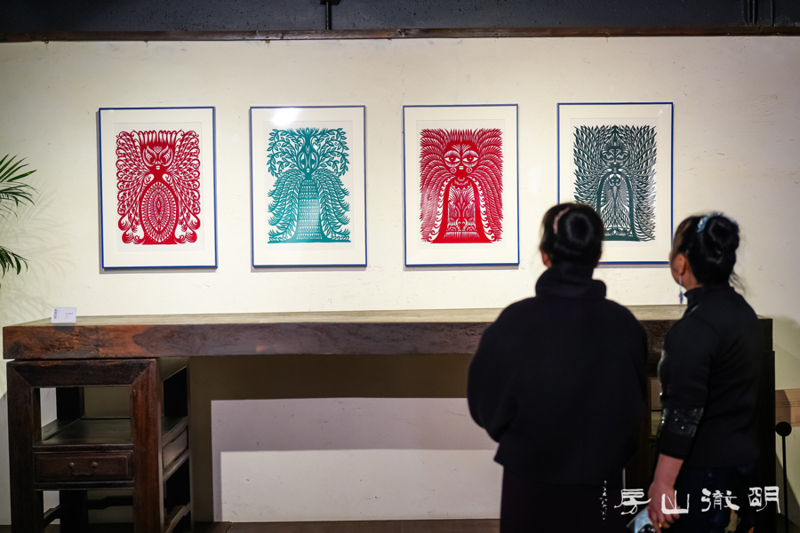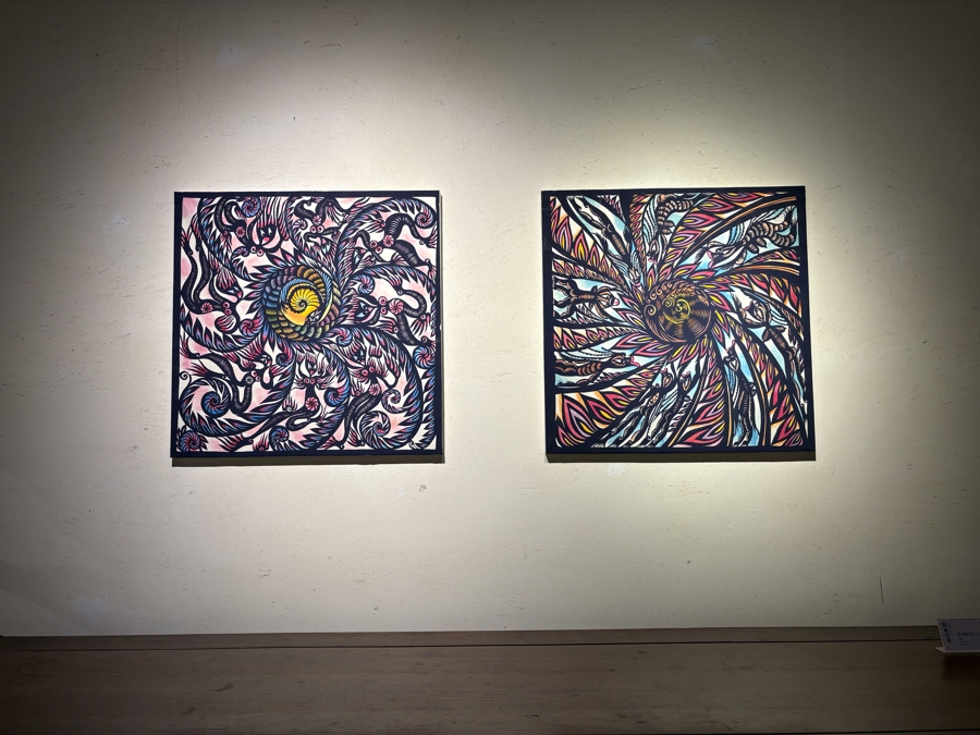 光从木格窗斜斜地照进来。白色的墙面上,一幅幅彩色的剪纸静静悬挂,而当光线穿过那些细密交错的镂空之处——纸上的飞鸟忽然有了振翅的影,水波泛起真实的涟漪,树木的枝桠在地面生长出斑驳的印记。剪纸不再是贴在窗上的平面花样,而成为光、影、空间与观看者共同参与的作品。